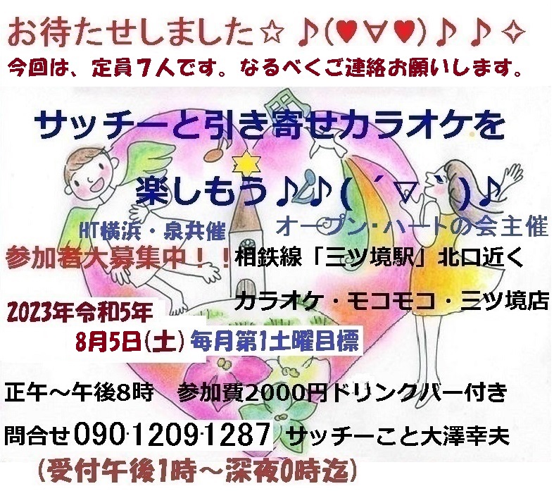 仲間と一緒に歌うの好き 仲間の歌を聞くの好き 歌を通じて知り合っていくのが好き 引き寄せカラオケって興味あるな そんな貴方のお声かけお待ちしています。 ・基本、カラオケを楽しむ会♪♪( ´▽`)♪ 歌を楽しみ、楽しい人生を引き寄せよう♪♪ 【注】コロナ禍も緩和されてきているので、定員7人としました、ご参加の折は申し込みお願いします。 ・8月5日(土)正午〜午後8時(遅刻、早退、自由) ・カラオケモコモコ三ツ境店(横浜) 横浜相鉄線「三ツ境」北口出てすぐ近く(2階の北口通路 真っ直ぐ行くと道路の向こう側に見える) 横浜市旭区笹野台1丁目1−43 第二広島ビル 2F ・参加費 2000円(基本料+ドリンクバー、フレーク付きアイスクリーム食べ放題が人気+世話人薄謝)。それ以外の飲食希望はその都度現金での支払いでご自由にできます。(飲食持ち込み禁止) ♥興味関心のある方は、どなたでも参加できます。お問い合わせ、申込み、お待ちしています。 ★HT横浜・泉+オープンハートの会共催 ★申込み問い合せ: 045-814-6111泉が丘教育心理相談所 090-1209-1287サッチーこと 大澤幸夫 (受付:正午〜深夜0時) メール: ugh45658@nifty.com 詳しい内容を知りたい方はお気軽にお問い合わせください。 |