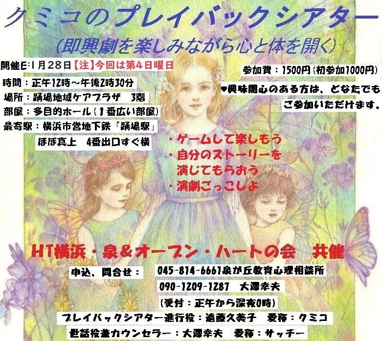 仲間とゲームしたり 自分のストーリーを演じてもらったり、 人のストーリーを自分が演じてみたり 演劇ごっこみたいなことするの好きだな〜 という、そんなあなたのお声かけ、お待ちしています。 1/28(日)(今回は第4日曜になりました)「久美子のパレイバック・シアター」 (表現ゲームや、即興劇を楽しみながら心と体を開放するワークショップです。最後に、参加者の誰かが語ったストーリーを誰かがしっかりと受けとめ、自分なりに表現し、語り手にプレゼントします。) 【注】正午〜午後2時30分 ・踊場地域ケアプラザ 3階 多目的ホール(1番広い部屋) 横浜市営地下鉄「踊場駅」ほぼ真上 4番出口すぐ横 。 隣にデニーズ、道路をはさんで真向かいに薬屋あり。 ・参加費各1500円(初参加1000円) ♥プレイバック・シアター進行役 遠藤久美子 愛称:クミコ プロフィール ▼1972年6月13日生まれ。東洋大学文学部教育学科を卒業後、印刷会社の営業として4年間勤務。この頃より、プロセス心理学、プレイバック・シアター、サイコドラマ、カウンセリング、エンカウンターグループ、など、各種心理療法を学ぶ。▼また、横浜のコミュニティにおいてプレイバック・シアターのワークショップを自ら精力的に主催して行っている。また、スペース・友・遊 プレイバック・シアターのアクターとして老人ホームや、小学校、中学校、精神障害者の作業所、各区の施設などで即興劇を通して人々の心の声を形にしてみんなで分かち合い心の解放と癒しの活動を行っている。 ーーーー共通内容ーーーーーーーーーーーーーーーーーーー ♥興味関心のある方は、どなたでも参加できます。お問い合わせ、申込み、お待ちしています。 ★HT横浜・泉+オープンハートの会共催 ★申込み問い合せ: 045-814-6111泉が丘教育心理相談所 090-1209-1287サッチーこと 大澤幸夫 (受付:正午〜深夜0時) メール: ugh45658@nifty.com 詳しい内容を知りたい方はお気軽にお問い合わせください。 ・ ●世話人兼カウンセラー 大澤幸夫 愛称:サッチー プロフィール 1952年山梨生まれ。1977年泉が丘教育心理相談所開業。心理&スピリチュアルカウンセラー。主にゲシュタルト・スピリチュアル・カウンセリングを中心に問題のある人生から豊かな人生への創造を手伝っている。1975年サイコセラピスト篠崎忠男に弟子入り、1979日本カウンセリングアカデミーにて総合的なカウンセリングを学ぶ。 また、主にロジャーズのパーソンセンタードアプローチ、ユングの分析心理学、ゲシュタルトセラピー、再決断療法などの影響を強く受ける。また、カナダ在住の心理療法家でありスピリチュアル・リーダーでもあるクリストファー・ムーンによるプロセス心理学の指導を直接受け強い影響を受ける。また、バシャール、神との対話、セス・ブック、エイブラハムの引き寄せの法則などの影響も受け、それぞれを総合した独自のカウンセリングを展開。 福祉活動 1994〜1997「心の悩み、病、不登校などの偏見と差別を超えて共に生きる会・たたみハウス(泉区四季の会作業所土日お借りして)」代表を務める。1995〜2004「不登校と共に歩む会(フリースクール)大澤の自宅にて」代表務める。 著書「無条件の愛による心理カウンセリングー問題から豊さへの対話集ー」VOICE出版から発売中。 共著「プリズムの色は七色(あいりと不思議な人形)」三宅恵子編 教育報道社 絶版 |