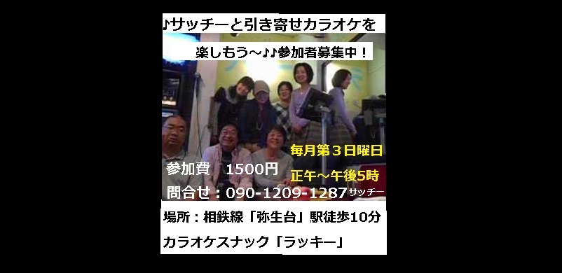 ・・・・・簡単お知らせ・・・・・ 3月20日(第3日曜) 基本、カラオケを楽しむ会♪♪( ´▽`)♪ 正午12時〜午後5時 横浜相鉄線「弥生台駅」徒歩10分のカラオケスナック「ラッキー」にて 参加費 1500円(昼オケ基本料+世話人料) ーーーーー詳しい内容です↓ーーーーーーーーーーーーーーーーーーー サッチーと引き寄せカラオケ「楽しく歌って、楽しい人生を引き寄せちゃおう(^O^)/」 参加者募集中! 初参加者も大歓迎(^O^)/ もちろん、歌のジャンルは無限大♪なんでもいいから楽しんじゃおう♪ もちろん悲しい歌も、泣いてもいいし、楽しんでもいいし、踊ってもいいし〜〜(=´∀`)人(´∀`=) ではでは、いつものように・スピリチュアル的に言えば、すべての人生に意味が有り、素晴らしい!そして、歌はそれを深く味わい、意味深いものにしてくれる(v^-゚) 引き寄せ的に言えば、、自分のすべての人生が意味深く感じられれば、自分と他人の人生に元々ある信頼と愛に気づき、願いの引き寄せパワーに気づくでしょう(v^-゚))byサッチー ★前もって参加者8人見込めるときは、貸切にしてくれるとのお約束をもらってまーす\(^o^)/ ですので、前もって参加予定の立つ方は、早めの連絡よろしくお願いしまーす(^人^)合掌 でも、もちろん当日都合がついた方、駆け込み参加大歓迎ですよ〜\(^o^)/ ・世話人:サッチー(大澤幸夫)softbank090-1209-1287(受付午後2時から深夜2時、当日は正午から) (都合の付く人は、終了後ファミレスでおしゃべりなどしましょう(^O^)/) ・参加費:1500円(内訳:基本昼オケ代1000円+世話人謝礼500円) (歌い放題、ウーロン茶飲み放題、コーヒー1杯分。また、酒、飲み物以外は持ち込み自由でもあるから、店で扱っていない食べ物やお菓子も持ってきてもOK! もちろん、アルコール類や店の食事は別途料金で注文もできます。) ・サッチーは、簡単なたたくおもちゃやとか〜簡単コスプレグッズとか〜を持ってくね〜少しだけど(^^ゞ だいたいいつもこんな感じで〜〜、曲が入っちゃったら、適当に合間を縫って、 ♪最初は呼んで欲しいニックネーム ♪自己紹介♪自己PR ♪名刺持ってる人は名刺交換したり〜 ♪あとは、この歌でどんなことを引き寄せたいか〜とか、この歌のなにが好き〜〜この歌で、こんな気分を味わいたい〜〜みたいなことを分かち合いながら ♪歌ったり踊ったり、演じたり、コスプレしたり、声援などして楽しんじゃお〜う(^O^)/ と、取りあえずは計画していま〜〜〜〜す ♬ ♪歌うの大好き、カラオケ大好き、踊るの大好き、コスプレ大好き、女装男装大好き、もちろん、歌うより聞くの大好き、声援するの大好きって人も大歓迎〜(^O^)/ ♪「神対」大好き、バシャール大好き、スピリチュアル大好き、引き寄せ大好き、エイブラハム大好き、その他ラムサ、セス、ウィリアム・レーネン、ヘミシンク大好き、ゲシュタルト・ワーク大好き、ケイティ・ワーク大好きって人も大歓迎(^O^)/ (都合の付く人は、終了後ファミレスでおしゃべりなどしましょう(^O^)/) 会場は、サッチーのいきつけのスナック「ラッキー」。 このマスターは、約5年前にオリエントレコードから「一月の雨」と「新宿の花(デュエット)」でデビューした松喜優馬と奥さんひろみのスナック。最近(というかそろそろ3年くらい)知りあって、仲良くしていて、たまに、マスター代理も頼まれてる。日曜の昼オケは殆どお客さんもいないので、引き寄せカラオケやるのにもってこいじゃん!ってことで、やることにしました〜。 【注】し、しかし、貸切で無いときは〜、カラオケスナックなので、引き寄せカラオケなんて知らない、お客さんが来ることもあり・・こないこともあり・・一杯くることもあり・・・それはまた、何が起こるか分かりません。今までも、ハプニング続出〜〜ってことで、よろしく〜〜です(^O^)/ ♥mixiやっている人は、こちらにも参加表明よろしくね↓ http://mixi.jp/view_schedule_entry.pl?id=b887dd2cc616982cb5dad3a35c2cc702&owner_id=14444910 ●場所:「ラッキー」、サッチー行きつけの、歌手松喜優馬のカラオケスナック。 横浜市泉区新橋町1205-2 電話070-6554-3038 ※駐車場必要な方は・事前・にご連絡ください。 ・横浜市「弥生台」駅から徒歩10分。「新橋町」バス停すぐそば。カラオケスナック「ラッキー」 ・弥生台駅や、戸塚駅、三ツ境駅などからバスでも来れるとのこと、「新橋町」バス停のすぐそば、バス停から「ラッキー」の電光掲示板が見える。 【注】行き方わかんないって人は、連絡もらえれば、「弥生台駅」迎えに行きます。携帯ソフトバンク 090-1209-1287 HT横浜&オブンハートの会 共催 ★申込み問い合せ:ugh45658@nifty.com 045−814−6111 泉が丘教育心理相談所 090−1209−1287 大澤幸夫ことサッチー (午後2時〜深夜2時、当日は正午から) ホーム:http://homepage1.nifty.com/hapysaty/ 【付録】★希望があれば、以下のグループも開催しますので、お声かけ、お問い合わせを気楽にしてくださいね〜 ●久美子のプレイバックシアター復活! 「一コマを演じてみたり、自分