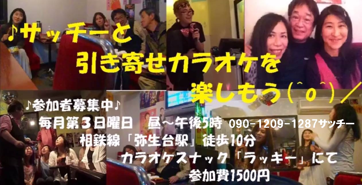 ♥ハートの羅針盤が興味関心に向いた人〜〜一緒に歌えるのを楽しみにしていま〜す♪♪( ´▽`)♪ ・・・・引き寄せカラオケ・簡単お知らせ・・・・・ 6/19(第3日曜)「サッチーと引き寄せカラオケを楽しもう〜(^O^)/」+コスプレもOKよ(^_-)-☆参加者募集中☆ ・基本、カラオケを楽しむ会♪♪( ´▽`)♪ ・正午12時〜午後5時 ・横浜相鉄線「弥生台駅」徒歩10分のカラオケスナック「ラッキー」にて ・参加費 1500円(昼オケ基本料+世話人料) ーーーーー詳しい内容です↓ーーーーーーーーーーーーーーーーーーー サッチーと引き寄せカラオケ「楽しく歌って、楽しい人生を引き寄せちゃおう(^O^)/」 参加者募集中! 初参加者も大歓迎(^O^)/ もちろん、歌のジャンルは無限大♪なんでもいいから楽しんじゃおう♪ もちろん悲しい歌も、泣いてもいいし、楽しんでもいいし、踊ってもいいし〜〜(=´∀`)人(´∀`=) ではでは、いつものように・スピリチュアル的に言えば、すべての人生に意味が有り、素晴らしい!そして、歌はそれを深く味わい、意味深いものにしてくれる(v^-゚) 引き寄せ的に言えば、、自分のすべての人生が意味深く感じられれば、自分と他人の人生に元々ある信頼と愛に気づき、願いの引き寄せパワーに気づくでしょう(v^-゚))byサッチー ★前もって参加者8人見込めるときは、貸切にしてくれるとのお約束をもらってまーす\(^o^)/ ですので、前もって参加予定の立つ方は、早めの連絡よろしくお願いしまーす(^人^)合掌 でも、もちろん当日都合がついた方、駆け込み参加大歓迎ですよ〜\(^o^)/ ・世話人:サッチー(大澤幸夫)softbank090-1209-1287(受付午後2時から深夜2時、当日は正午から) (都合の付く人は、終了後ファミレスでおしゃべりなどしましょう(^O^)/) ・参加費:1500円(内訳:基本昼オケ代1000円+世話人謝礼500円) (歌い放題、ウーロン茶飲み放題、コーヒー1杯分。また、酒、飲み物以外は持ち込み自由でもあるから、店で扱っていない食べ物やお菓子も持ってきてもOK! もちろん、アルコール類や店の食事は別途料金で注文もできます。) ・サッチーは、簡単なたたくおもちゃやとか〜簡単コスプレグッズとか〜を持ってくね〜少しだけど(^^ゞ だいたいいつもこんな感じで〜〜、曲が入っちゃったら、適当に合間を縫って、 ♪最初は呼んで欲しいニックネーム ♪自己紹介♪自己PR ♪名刺持ってる人は名刺交換したり〜 ♪あとは、この歌でどんなことを引き寄せたいか〜とか、この歌のなにが好き〜〜この歌で、こんな気分を味わいたい〜〜みたいなことを分かち合いながら ♪歌ったり踊ったり、演じたり、コスプレしたり、声援などして楽しんじゃお〜う(^O^)/ と、取りあえずは計画していま〜〜〜〜す ♬ ♪歌うの大好き、カラオケ大好き、踊るの大好き、コスプレ大好き、女装男装大好き、もちろん、歌うより聞くの大好き、声援するの大好きって人も大歓迎〜(^O^)/ ♪「神対」大好き、バシャール大好き、スピリチュアル大好き、引き寄せ大好き、エイブラハム大好き、その他ラムサ、セス、ウィリアム・レーネン、ヘミシンク大好き、ゲシュタルト・ワーク大好き、ケイティ・ワーク大好きって人も大歓迎(^O^)/ (都合の付く人は、終了後ファミレスでおしゃべりなどしましょう(^O^)/) 会場は、サッチーのいきつけのスナック「ラッキー」。 このマスターは、約5年前にオリエントレコードから「一月の雨」と「新宿の花(デュエット)」でデビューした松喜優馬と奥さんひろみのスナック。最近(というかそろそろ3年くらい)知りあって、仲良くしていて、たまに、マスター代理も頼まれてる。日曜の昼オケは殆どお客さんもいないので、引き寄せカラオケやるのにもってこいじゃん!ってことで、やることにしました〜。 【注】し、しかし、貸切で無いときは〜、カラオケスナックなので、引き寄せカラオケなんて知らない、お客さんが来ることもあり・・こないこともあり・・一杯くることもあり・・・それはまた、何が起こるか分かりません。今までも、ハプニング続出〜〜ってことで、よろしく〜〜です(^O^)/ ●場所:「ラッキー」、サッチー行きつけの、歌手松喜優馬のカラオケスナック。 横浜市泉区新橋町1205-2 電話070-6554-3038 ※駐車場必要な方は・事前・にご連絡ください。 ・横浜市「弥生台」駅から徒歩10分。「新橋町」バス停すぐそば。カラオケスナック「ラッキー」 ・弥生台駅や、戸塚駅、三ツ境駅などからバスでも来れるとのこと、「新橋町」バス停のすぐそば、バス停から「ラッキー」の電光掲示板が見える。 【注】行き方わかんないって人は、連絡もらえれば、「弥生台駅」迎えに行きます。携帯ソフトバンク 090-1209-1287 HT横浜&オブンハートの会 共催 ★申込み問い合せ:ugh45658@nifty.com 045−814−6111 泉が丘教育心理相談所 090−1209−1287 大澤幸夫ことサッチー (午後2時〜深夜2時、当日は正午から) ホーム:http://homepage1.nifty.com/hapysaty/ 【付録】★希望があれば、以下のグループも開催しますので、お声かけ、お問い合わせを気楽にして