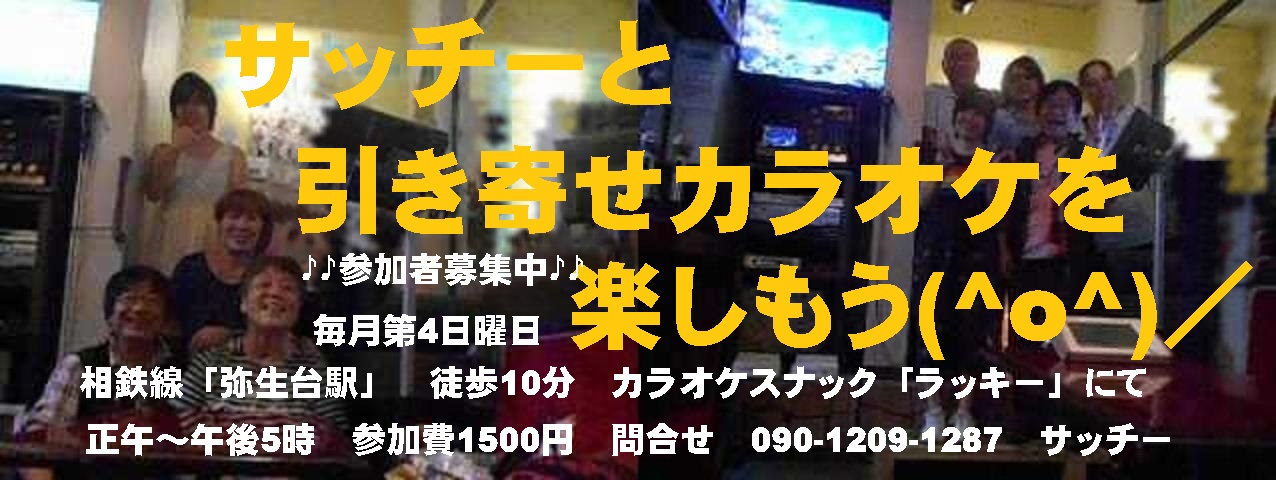 ♥ハートの羅針盤が興味関心に向いた人〜〜この指と〜ま、れ☝ ♪♪( ´▽`)/♪ ・・・・引き寄せカラオケ・簡単お知らせ・・・・・ ・基本、カラオケを楽しむ会♪♪( ´▽`)♪ 歌を楽しみ、楽しい人生を引き寄せよう♪♪ ・11月27日(日)正午12時〜午後5時 (今後も毎月第4日曜開催の予定です) ・横浜相鉄線「弥生台駅」徒歩10分のカラオケスナック「ラッキー」にて ・参加費 1500円(昼オケ基本料+世話人料) ★申込み問い合せ:ugh45658@nifty.com 090−1209−1287 大澤幸夫ことサッチー (午後2時〜深夜2時、当日は正午から) ーーーーー詳しい内容です↓ーーーーーーーーーーーーーーーーーーー サッチーと引き寄せカラオケ「楽しく歌って、楽しい人生を引き寄せちゃおう(^O^)/」 参加者募集中! 初参加者も大歓迎(^O^)/ もちろん、歌のジャンルは無限大♪なんでもいいから楽しんじゃおう♪ もちろん悲しい歌も、泣いてもいいし、楽しんでもいいし、踊ってもいいし〜〜(=´∀`)人(´∀`=) ではでは、いつものように・スピリチュアル的に言えば、すべての人生に意味が有り、素晴らしい!そして、歌はそれを深く味わい、意味深いものにしてくれる(v^-゚) 引き寄せ的に言えば、、自分のすべての人生が意味深く感じられれば、自分と他人の人生に元々ある信頼と愛に気づき、願いの引き寄せパワーに気づくでしょう(v^-゚))byサッチー ★前もって参加者8人見込めるときは、貸切にしてくれるとのお約束をもらってまーす\(^o^)/ ですので、前もって参加予定の立つ方は、早めの連絡よろしくお願いしまーす(^人^)合掌 でも、もちろん当日都合がついた方、駆け込み参加大歓迎ですよ〜\(^o^)/ ・世話人:サッチー(大澤幸夫)softbank090-1209-1287(受付午後2時から深夜2時、当日は正午から) (都合の付く人は、終了後ファミレスでおしゃべりなどしましょう(^O^)/) ・参加費:1500円(内訳:基本昼オケ代1000円+世話人謝礼500円) (歌い放題、ウーロン茶飲み放題、コーヒー1杯分。また、酒、飲み物以外は持ち込み自由でもあるから、店で扱っていない食べ物やお菓子も持ってきてもOK! もちろん、アルコール類や店の食事は別途料金で注文もできます。) ・サッチーは、簡単なたたくおもちゃやとか〜簡単コスプレグッズとか〜を持ってくね〜少しだけど(^^ゞ だいたいいつもこんな感じで〜〜、曲が入っちゃったら、適当に合間を縫って、 ♪最初は呼んで欲しいニックネーム ♪自己紹介♪自己PR ♪名刺持ってる人は名刺交換したり〜 ♪あとは、この歌でどんなことを引き寄せたいか〜とか、この歌のなにが好き〜〜この歌で、こんな気分を味わいたい〜〜みたいなことを分かち合いながら ♪歌ったり踊ったり、演じたり、コスプレしたり、声援などして楽しんじゃお〜う(^O^)/ と、取りあえずは計画していま〜〜〜〜す ♬ ♪歌うの大好き、カラオケ大好き、踊るの大好き、コスプレ大好き、女装男装大好き、もちろん、歌うより聞くの大好き、声援するの大好きって人も大歓迎〜(^O^)/ ♪「神対」大好き、バシャール大好き、スピリチュアル大好き、引き寄せ大好き、エイブラハム大好き、その他ラムサ、セス、ウィリアム・レーネン、ヘミシンク大好き、ゲシュタルト・ワーク大好き、ケイティ・ワーク大好きって人も大歓迎(^O^)/ (都合の付く人は、終了後ファミレスでおしゃべりなどしましょう(^O^)/) 会場は、サッチーのいきつけのスナック「ラッキー」。 このマスターは、約5年前にオリエントレコードから「一月の雨」と「新宿の花(デュエット)」でデビューした松喜優馬と奥さんひろみのスナック。最近(というかそろそろ5年くらい)知りあって、仲良くしていて、たまに、マスター代理も頼まれてる。日曜の昼オケは殆どお客さんもいないので、引き寄せカラオケやるのにもってこいじゃん!ってことで、やることにしました〜。 【注】し、しかし、貸切で無いときは〜、カラオケスナックなので、引き寄せカラオケなんて知らない、お客さんが来ることもあり・・こないこともあり・・一杯くることもあり・・・それはまた、何が起こるか分かりません。今までも、ハプニング続出〜〜ってことで、よろしく〜〜です(^O^)/ ●場所:「ラッキー」、サッチー行きつけの、歌手松喜優馬&ひろみのカラオケスナック。 横浜市泉区新橋町1205-2 電話070-6554-3038 ※駐車場必要な方は・事前・にご連絡ください。 ・横浜市「弥生台」駅から徒歩10分。「新橋町」バス停すぐそば。カラオケスナック「ラッキー」 ・弥生台駅や、戸塚駅、三ツ境駅などからバスでも来れるとのこと、「新橋町」バス停のすぐそば、バス停から「ラッキー」の電光掲示板が見える。 【注】行き方わかんないって人は、連絡もらえれば、「弥生台駅」迎えに行きます。携帯ソフトバンク 090-1209-1287 HT横浜&オブンハートの会 共催 ★申込み問い合せ:ugh45658@nifty.com 045−814−6111 泉が丘教育心理相談所 090−1209−1287 大澤幸夫ことサッチー (午後2時〜深夜2時、当日は正午から) ホーム:http://homepage1.nifty.com/hapysaty/ 【付録】★希