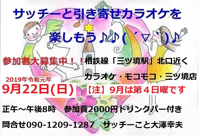 9/22(日) ♥ハートの羅針盤が興味関心に向いた人〜〜この指と〜まれ☝ ♪♪( ´▽`)/♪ ・・・・・引き寄せカラオケ・簡単お知らせ・・・・・ ・基本、カラオケを楽しむ会♪♪( ´▽`)♪ 歌を楽しみ、楽しい人生を引き寄せよう♪♪ ・9月22日(日)正午〜午後8時(遅刻、早退、自由) ・カラオケモコモコ三ツ境店(横浜) 横浜相鉄線「三ツ境」北口出てすぐ近く(2階の北口通路 真っ直ぐ行くと見える) 横浜市旭区笹野台1丁目1−43 第二広島ビル 2F ・参加費 2000円(基本料+ドリンクバー、フレーク付きアイスクリーム食べ放題が人気+世話人薄謝)。それ以外の飲食希望はその都度現金での支払いでご自由にできます。(飲食持ち込み禁止) ★申込み問い合せ:ugh45658@nifty.com 090−1209−1287 サッチーこと 大澤幸夫 (受付:正午から深夜0時) ーーーーー詳しい内容です↓ーーーーーーーーーーーーーーーーーーー サッチーと引き寄せカラオケ「楽しく歌って、楽しい人生を引き寄せちゃおう(^O^)/」 参加者募集中! 初参加者も大歓迎(^O^)/ もちろん、歌のジャンルは無限大♪なんでもいいから楽しんじゃおう♪ もちろん悲しい歌も、泣いてもいいし、楽しんでもいいし、踊ってもいいし〜〜(=´∀`)人(´∀`=) ではでは、いつものように・スピリチュアル的に言えば、すべての人生に意味が有り、素晴らしい!そして、歌はそれを深く味わい、意味深いものにしてくれる(v^-゚) 引き寄せ的に言えば、、自分のすべての人生が意味深く感じられれば、自分と他人の人生に元々ある信頼と愛に気づき、願いの引き寄せパワーに気づくでしょう(v^-゚))byサッチー ・世話人:サッチー(大澤幸夫)歌い踊るのが好きな心理&スピリチュアル・カウンセラー。 ・参加費:2000円(内訳:基本+ドリンクバー+世話人薄謝)それ以外の飲み食い希望者は実費でよろしく。(飲食持ち込み禁止) ・サッチーは、簡単なたたくおもちゃやとか〜簡単コスプレグッズとか〜を持ってくね〜少しだけど(^^ゞ だいたいいつもこんな感じで〜〜、曲が入っちゃったら、適当に合間を縫って、 ♪最初は呼んで欲しいニックネーム ♪自己紹介♪自己PR ♪名刺持ってる人は名刺交換したり〜 ♪あとは、この歌でどんなことを引き寄せたいか〜とか、この歌のなにが好き〜〜この歌で、こんな気分を味わいたい〜〜みたいなことがあったらかち合いながら、ないならないなりに ♪歌ったり踊ったり、演じたり、コスプレしたり、声援などして楽しんじゃお〜う(^O^)/ と、取りあえずは計画していま〜〜〜〜す♬ が、計画通りにいくかどうかは〜わかりませ〜ん( ̄▽ ̄;) ●場所:カラオケモコモコ三ツ境店 横浜相鉄線「三ツ境」北口出てすぐ近く(2階の北口通路真っ直ぐ行くと見える) 神奈川県横浜市旭区笹野台1丁目1−43 第二広島ビル 2F 045-362-2520 HT横浜&オブンハートの会 共催 ★申込み問い合せ:ugh45658@nifty.com 045−814−6111 泉が丘教育心理相談所 090−1209−1287 大澤幸夫ことサッチー (受付:正午から深夜0時) |